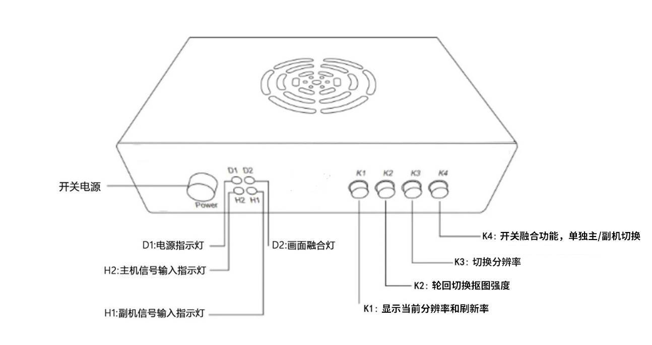 若此时按下Power红色按钮,没有插入其他任何视频线,融合器将D1红灯亮起